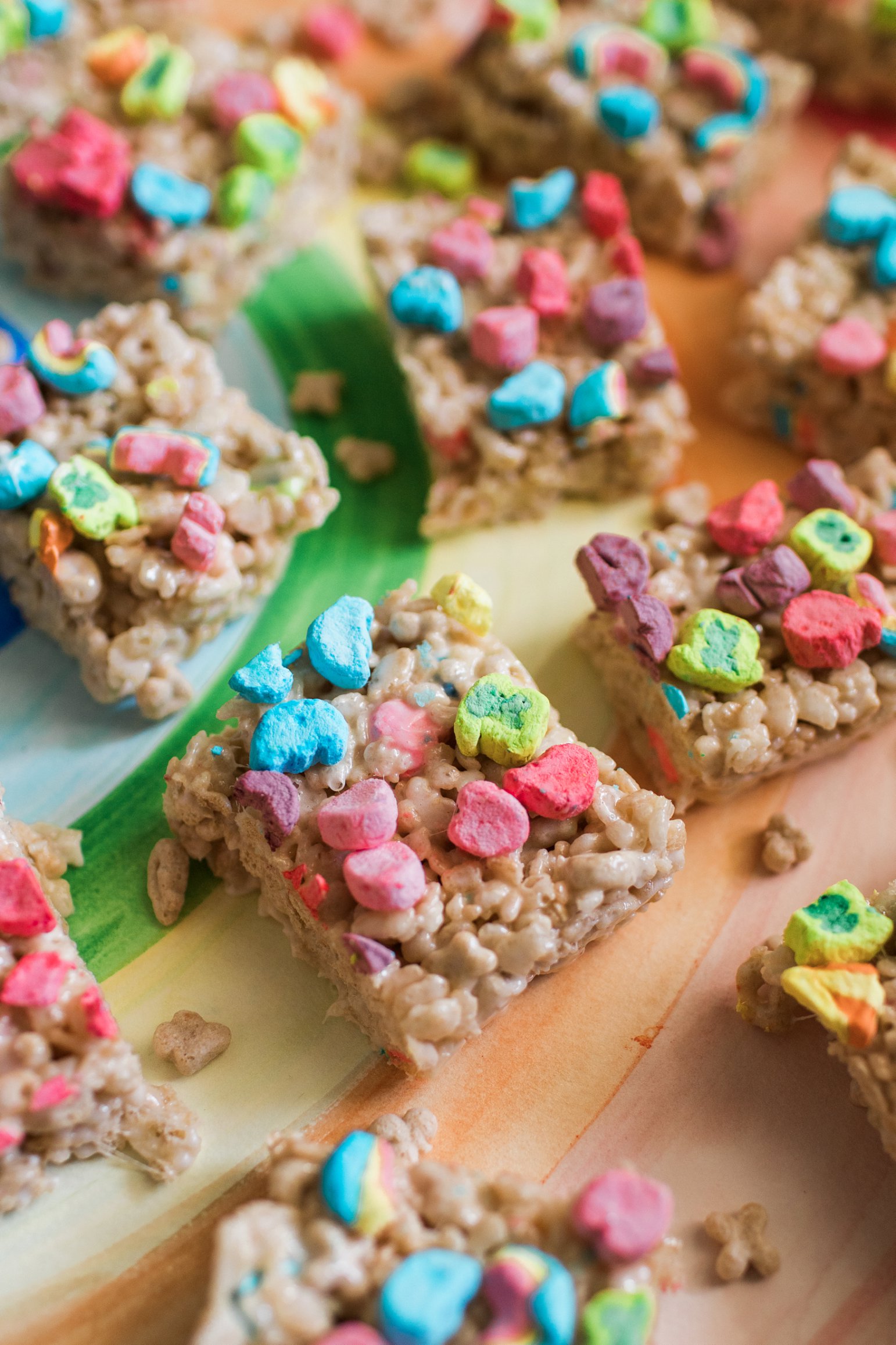 Lucky Charms Rice Krispie Treats Welcome to March, party friends! What an unusually cold winter we have had. Things even here in Florida are so dead and brown due to the cold freezes. I’m very much looking forward to new growth and color. These Rice Krispie treats mixed with Lucky Charms are the color-filled sweet…