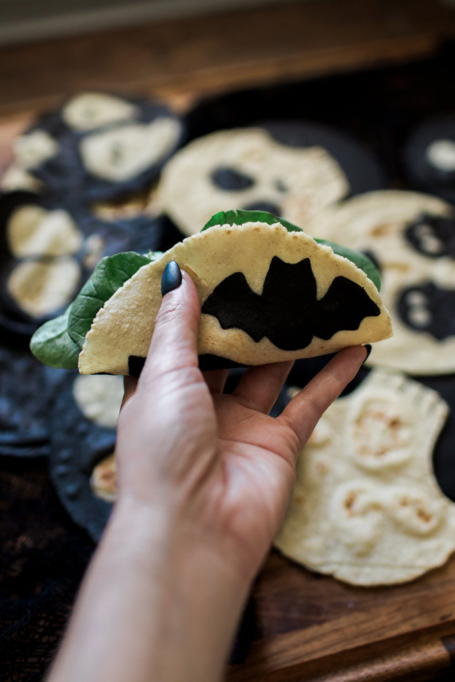 If you are looking for ways to level up your taco night for the season, give these super fun, black and white Halloween tortillas a go! Fresh off the skillet, warm and soft, these tortillas are absolutely delicious for your go-to tortilla recipe without even adding the designs. But if you want to get artsy, these are super fun to make, and I think even kids would enjoy lending a hand as well. I’m always looking for ways to involve (or lure) my kiddo into helping me in the kitchen!