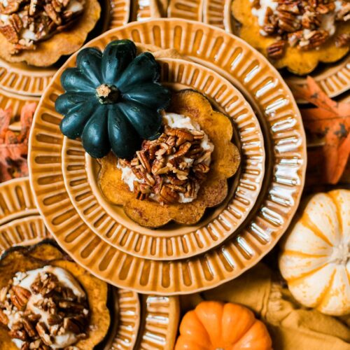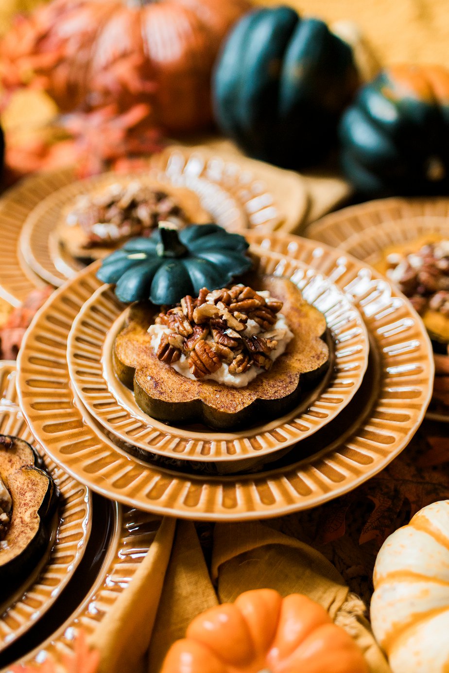 This recipe for acorn squash is sweet and tasty, topped with ricotta cheese and maple-coated chopped pecans. I love acorn squash roasted in the oven as a base for many dishes, not just sweet plates. My favorite thing is sweet and spicy, so I love a good chili in these wedges during this time of year, too! See how I served this dish in this dinner party post!