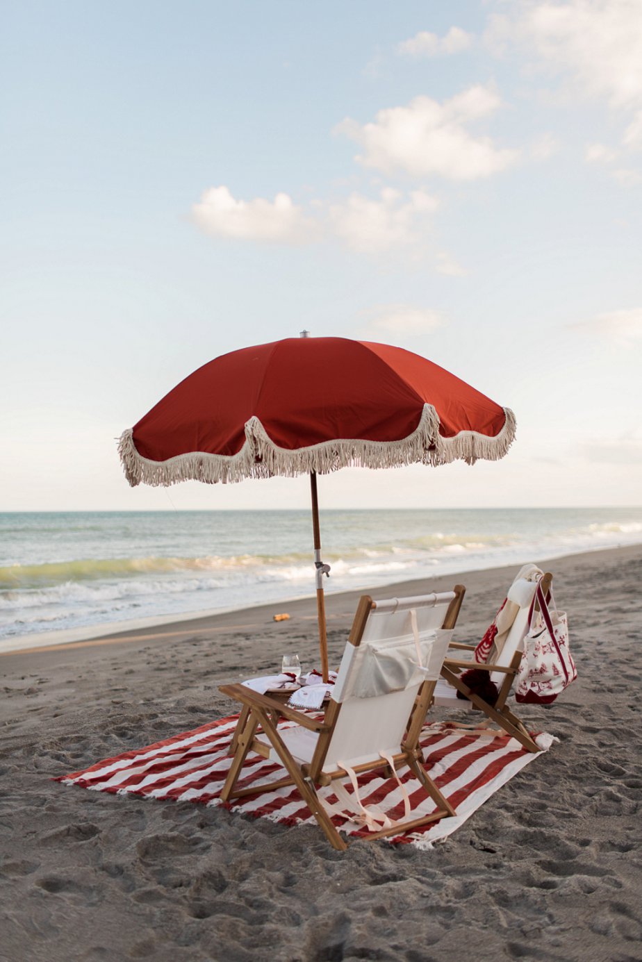 The red striped beach blanket, picnic table, and umbrella are all from Business & Pleasure’s Sirenuse collection. I use this little table all the time, it’s lightweight, foldable, and features wine glass holders for four! The chairs are from Serena & Lily, and I love that they are made of white canvas because they can complement all of my seasonal color palettes. The wine glasses are plastic, and they’ve held up for years! You can find those on Amazon here. Remember to keep glass off the beach and reduce single-use plastics, yay!