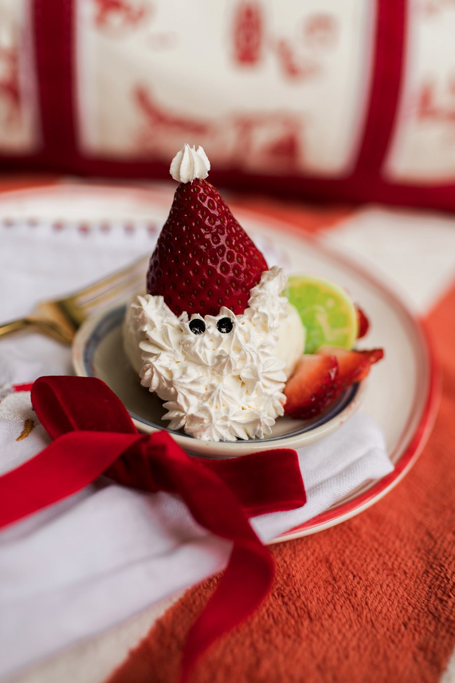 For dessert, I wanted something that was quintessentially Floridian. And what’s more Floridian than Key Lime Pie!? To make the individual Santas, I froze the pie before using a round cookie cutter to cut individual-sized circular pies. I topped them with one de-stemmed, upside-down strawberry and decorated them with whipped cream for the beard and hat pom-pom. I used a star tip on a piping bag to get the whipped cream texture here. Finally, I used mini chocolate morsels for the eyes.