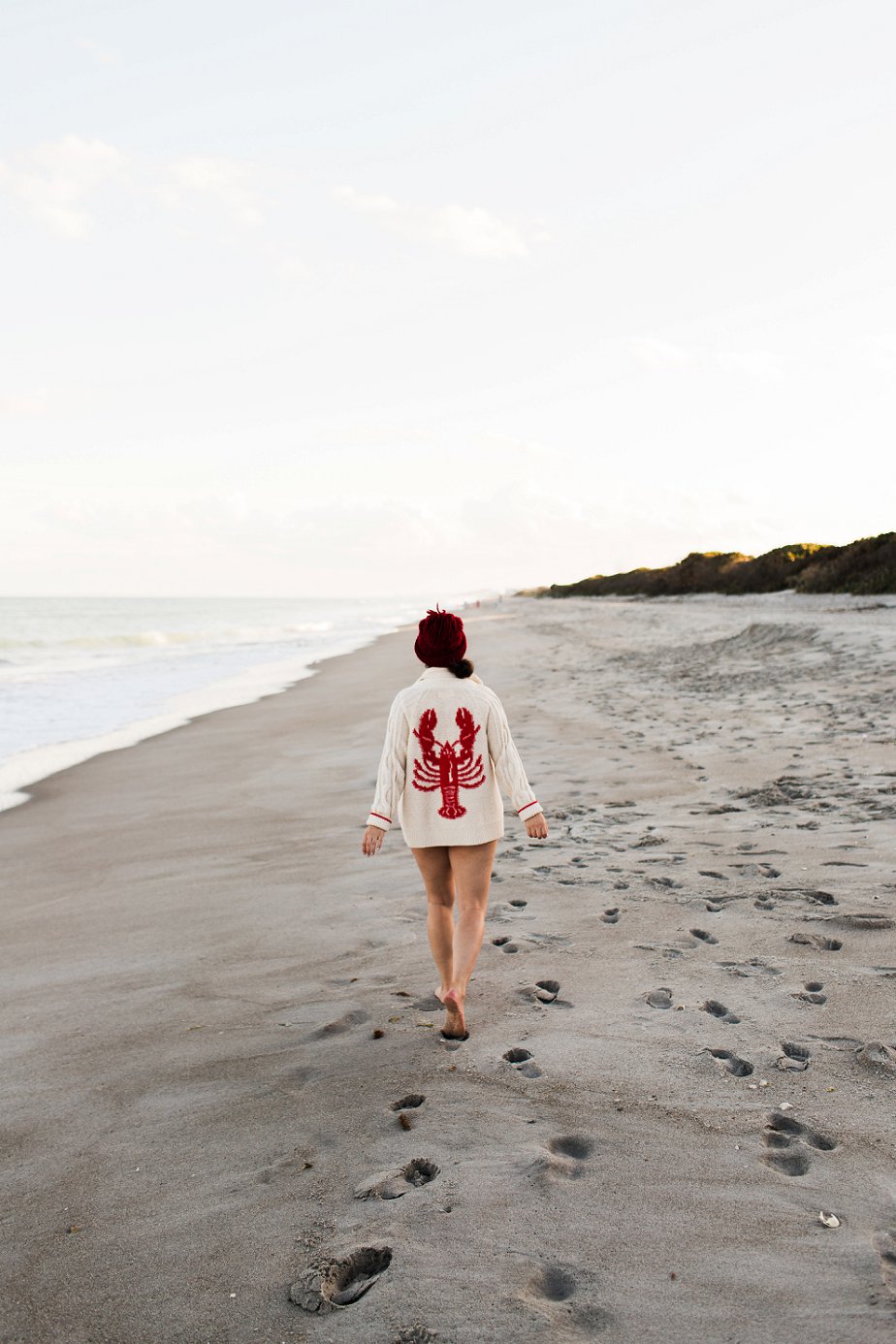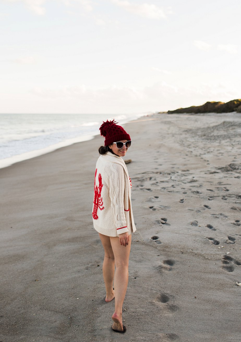 You’re in Florida, you can wear a bikini! I love this red striped swimsuit from J. Crew this time of year, and I pair it with my favorite Anthropologie lobster cardigan.