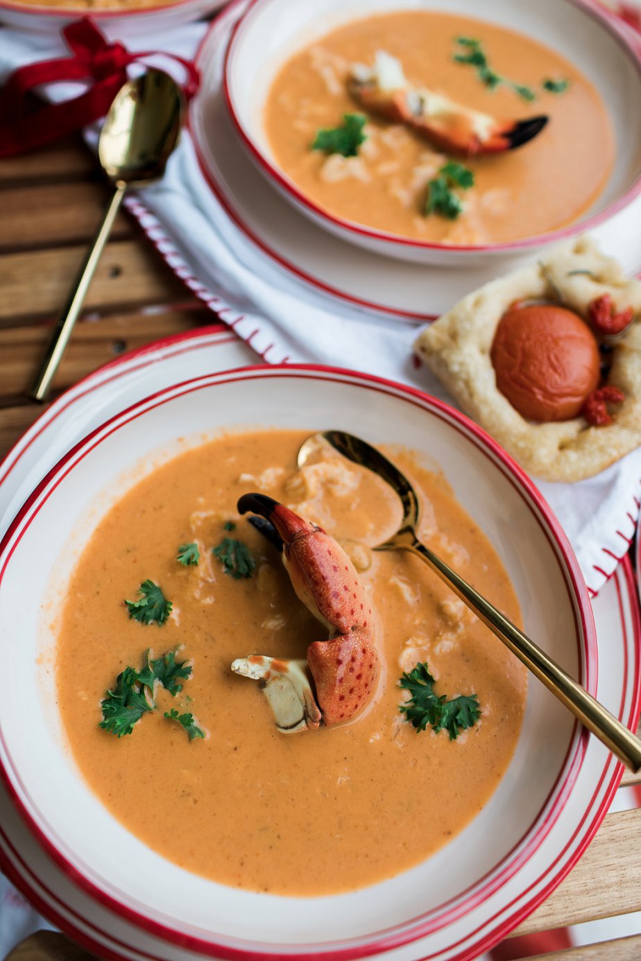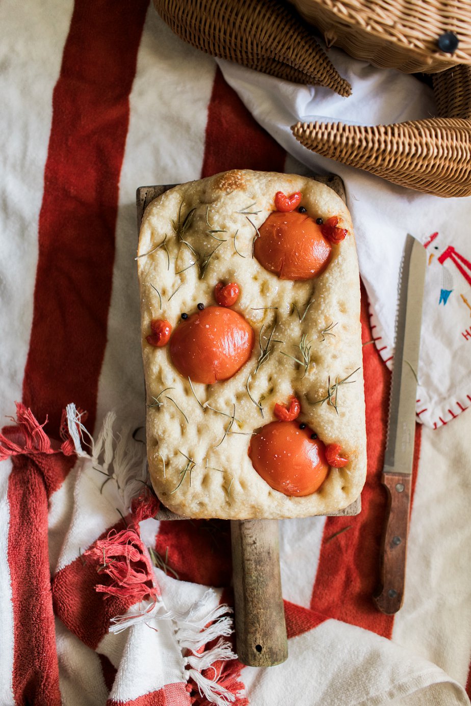 For dinner, I made a crab bisque recipe, which I found on Evolving Table! And paired it with a loaf of Crabby-Coccia. I used a leftover pizza dough I had in the refrigerator and topped it with vine-ripened tomato slices and halved cherry tomatoes to create little crabs. You can find my recipe for pizza dough here! Transporting soup isn’t hard if you have the right vessel. I like to use a stainless steel thermos to keep it hot and secure.
