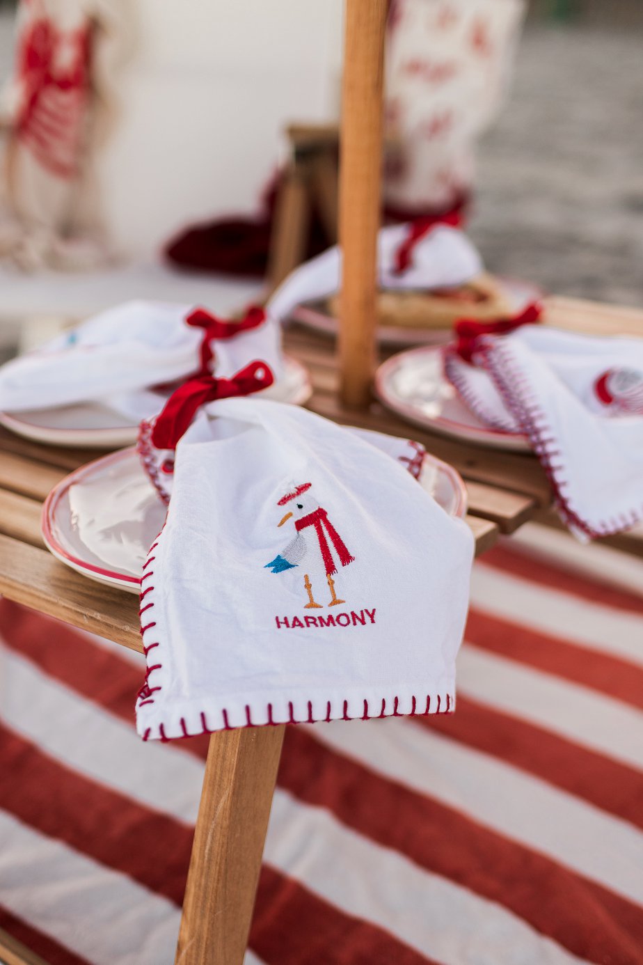Living in a warm, beach climate can be weird during the holidays. I’ve been in Florida for almost two decades, and I’m still adjusting to the seasons, or lack thereof. I decided long ago not to fight it and instead go with the funky beach vibes in my own way. One of my favorite events during this time of year is Surfing Santas. Tons of people crowd our beaches to take part or watch surfers dressed up in their Santa attire and take to the waves. How fun would it be to have a holiday picnic with Surfing Santas as the view? Either way, these red-striped nautical vibes are perfect for any festive-styled picnic!